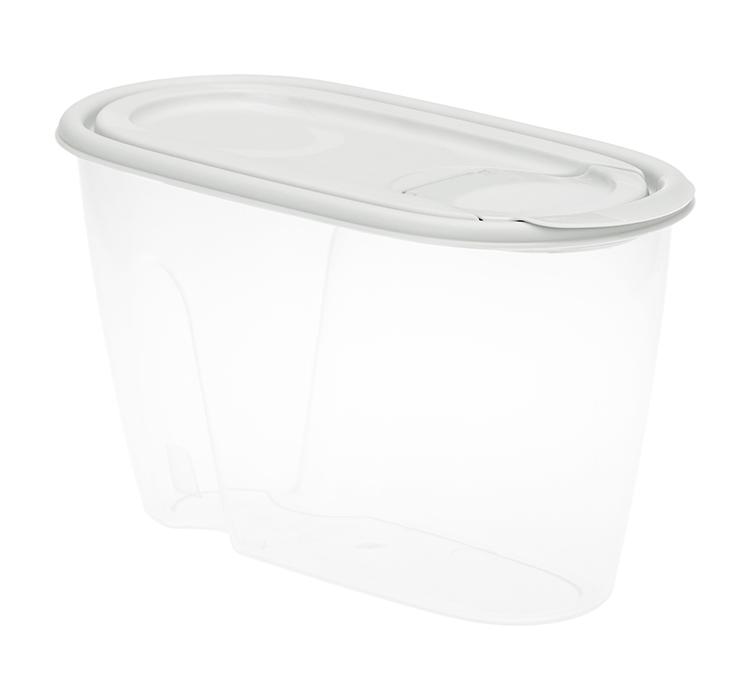 Емкость для сыпучих продуктов предназначена для круп, сахара, макаронных изделий. Аксессуар можно также использовать для хранения стирального порошка. Благодаря уплощенной форме и специальным выемкам для пальцев контейнеры удобно доставать с полок одной рукой. Если позволяет высота кухонного шкафа, изделия можно штабелировать с целью экономии места. Крышка плотно прилегает к корпусу – если емкость упадет, содержимое не рассыплется.