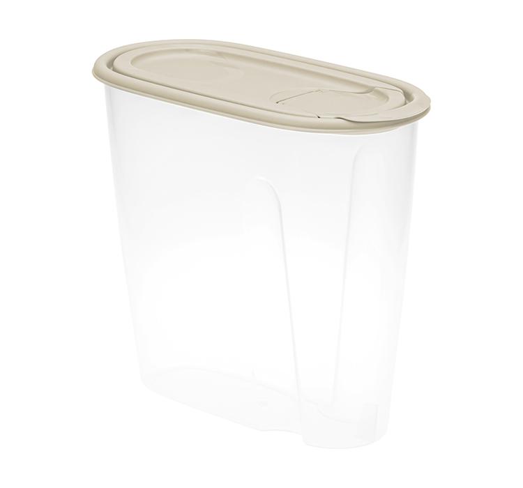 Емкость для сыпучих продуктов предназначена для круп, сахара, макаронных изделий. Аксессуар можно также использовать для хранения стирального порошка. Благодаря уплощенной форме и специальным выемкам для пальцев контейнеры удобно доставать с полок одной рукой. Если позволяет высота кухонного шкафа, изделия можно штабелировать с целью экономии места. Крышка плотно прилегает к корпусу – если емкость упадет, содержимое не рассыплется.