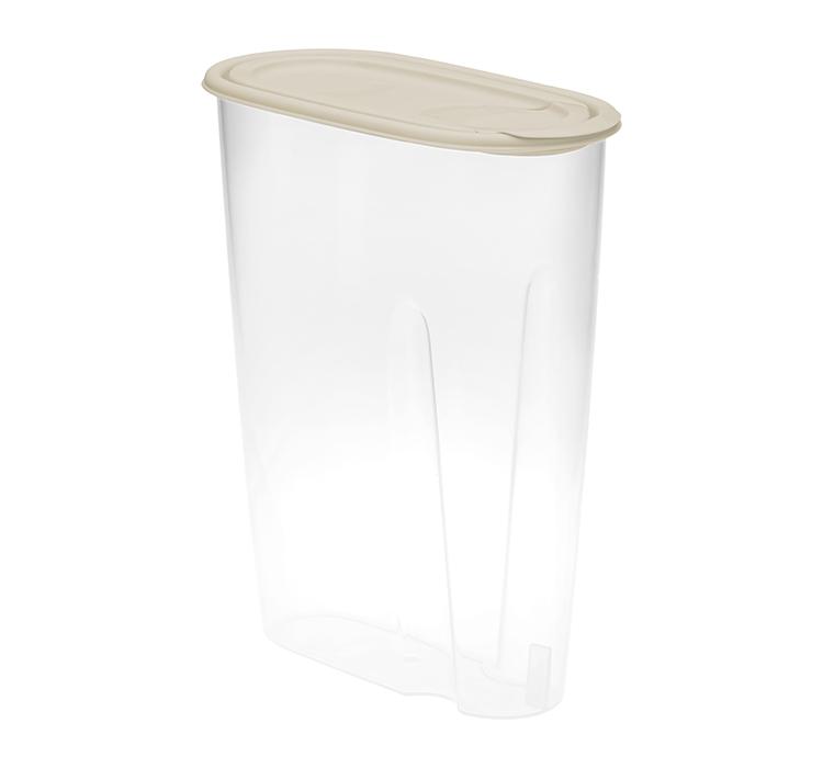 Емкость для сыпучих продуктов предназначена для круп, сахара, макаронных изделий. Аксессуар можно также использовать для хранения стирального порошка. Благодаря уплощенной форме и специальным выемкам для пальцев контейнеры удобно доставать с полок одной рукой. Если позволяет высота кухонного шкафа, изделия можно штабелировать с целью экономии места. Крышка плотно прилегает к корпусу – если емкость упадет, содержимое не рассыплется.
