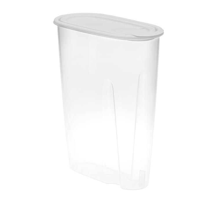 Емкость для сыпучих продуктов предназначена для круп, сахара, макаронных изделий. Аксессуар можно также использовать для хранения стирального порошка. Благодаря уплощенной форме и специальным выемкам для пальцев контейнеры удобно доставать с полок одной рукой. Если позволяет высота кухонного шкафа, изделия можно штабелировать с целью экономии места. Крышка плотно прилегает к корпусу – если емкость упадет, содержимое не рассыплется.