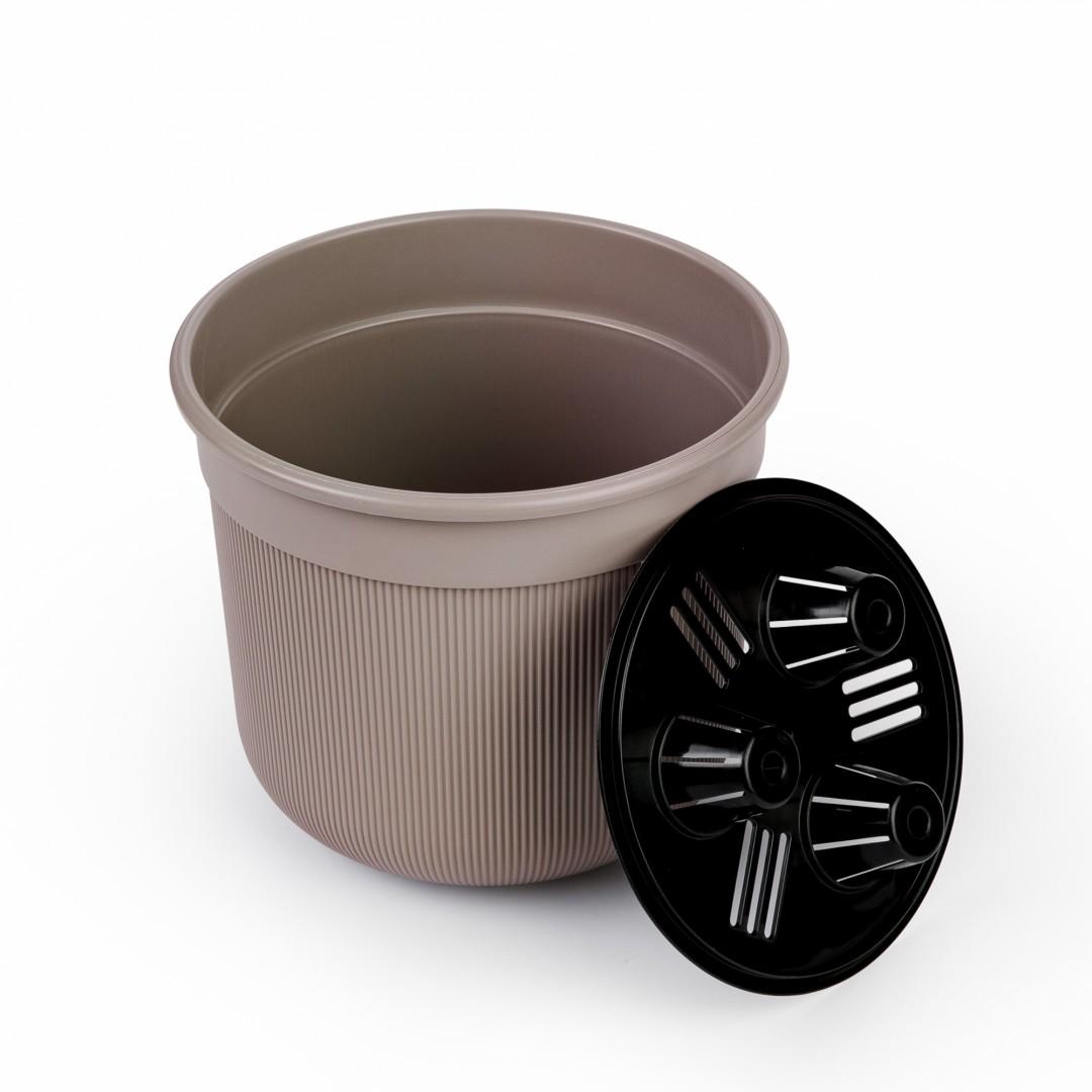 Горшок «Сканди» представляет собой оригинальную конструкцию с приятной наощупь матовой поверхностью и рельефными гранями. Он подходит для высаживания как комнатных, так и уличных цветов. Горшок со вставкой изготовлен из прочного и легкого пластика. Материал не деформируется, не боится воздействия прямых солнечных лучей и взаимодействия с химикатами. Плоская дренажная вставка на ножках гарантирует правильный отток воды, что помогает избежать переувлажнения грунта и загнивания корней. Емкости органично смотрятся в интерьере гостиной и кухни, на балконе и в офисе