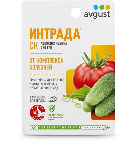 Avgust Интрада – профессиональный фунгицид для борьбы с широким спектром заболеваний на овощных культурах и винограде. Оказывает положительное физиологическое действие на растения, повышает качество урожая, защищает от фитофтороза, альтернариоза, мучнистой росы, ризоктониоза, пероноспороза и других болезней. Также препарат быстро подавляет прорастающие споры патогенов. Эффект проявляется в течение часа после применения. Является аналогом препарата Квадрис.