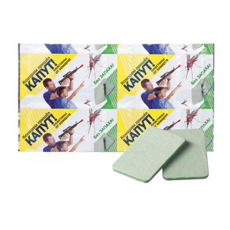 «Капут» — пластины электрофумигирующие, инсектицидные для уничтожения комаров в помещении Разрешено к применению в присутствии людей. 10 пластин рассчитаны на 100 часов активного действия.