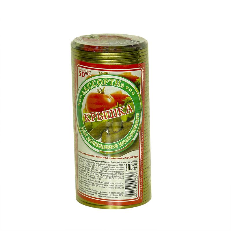 Крышка СКО1-82 Ассорти 1+19, изготовлена из белой жести и покрыта пищевым лаком.