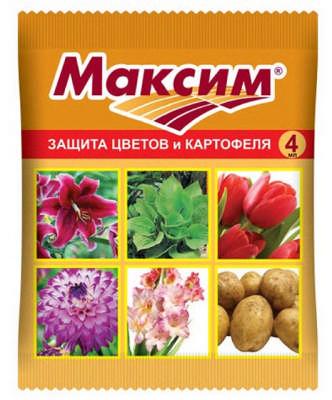 «Максим» — Препарат защитно-контактного действия для защиты от болезней луковичных (тюльпаны, гладиолусы, лилии и т.д.), георгинов, пионов, корней и корневищ других цветов, а также семенного картофеля. Создает защитный барьер на поверхности посадочного материала и в прикорневой зоне в почве. Эффективен против всех видов гнилей, плесеней, фузариоза, ризоктониоза, парши и других заболеваний. Защищает растения от болезней в течение всего периода роста и хранения.