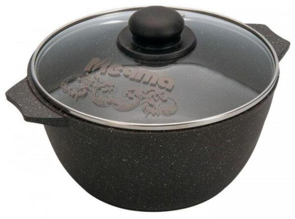 Кастрюля Мечта Гранит объемом 4 л изготовлена из литого алюминия. Имеет крашеное дно, которое не царапает стеклокерамические варочные поверхности. Имеет стеклянную крышку с пароотводом, предотвращающим выкипание жидкости. Две литые ручки из алюминия удобны для захвата. Антипригарное покрытие премиум класса GRANIT ЛЮКС представляет собой многослойную систему, упроченную кристаллами минералов. Данные частицы выполняют роль армирующего звена, благодаря чему получается мощнейшая монолитная структура, которая многократно повышает антипригарные свойства покрытия. Подходит для всех типов плит, кроме индукционных. Можно использовать в духовке без крышки и мыть в посудомоечной машине.