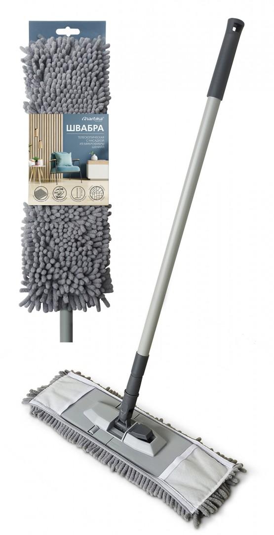 Это идеальный выбор для эффективной сухой и влажной уборки полов. Телескопическая рукоятка позволяет регулировать высоту швабры от 75 до 125 см. Отверстие в ручке служит для подвеса швабры на крючок, что экономит место и упрощает доступ к инструменту. Поворотный механизм вращения платформы 360° обеспечивает возможность легкой уборки в труднодоступных местах, в углах, под мебелью. Швабра оснащена впитывающей насадкой из микрофибры «шенилл» («пальчиковая»), которая обладает антистатическими свойствами, притягивает пыль, волосы и шерсть, не оставляет разводов на поверхности. Сменную насадку можно стирать вручную или в стиральной машине при температуре 30-40°С. Подходит для всех типов напольных покрытий, особенно эффективна на рельефных поверхностях.